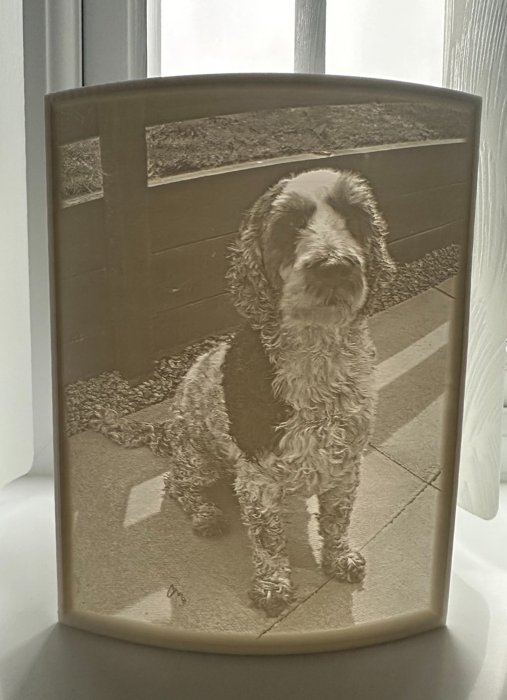 Phase 1 of Memorial things to make for Jasper, is this 3D printed Lithophane. Phase 2 will be a Memorial slate plaque which I will try to get done soon.