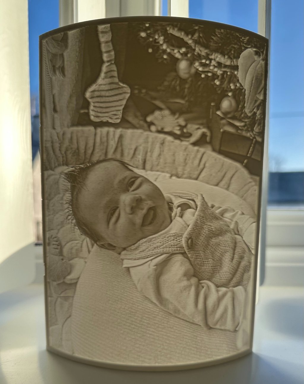 Did a couple more tweaks to settings on 3D printer to do this Lithophane print. Came out really good I will give it to my boss as a unique gift for the birth of there first baby.